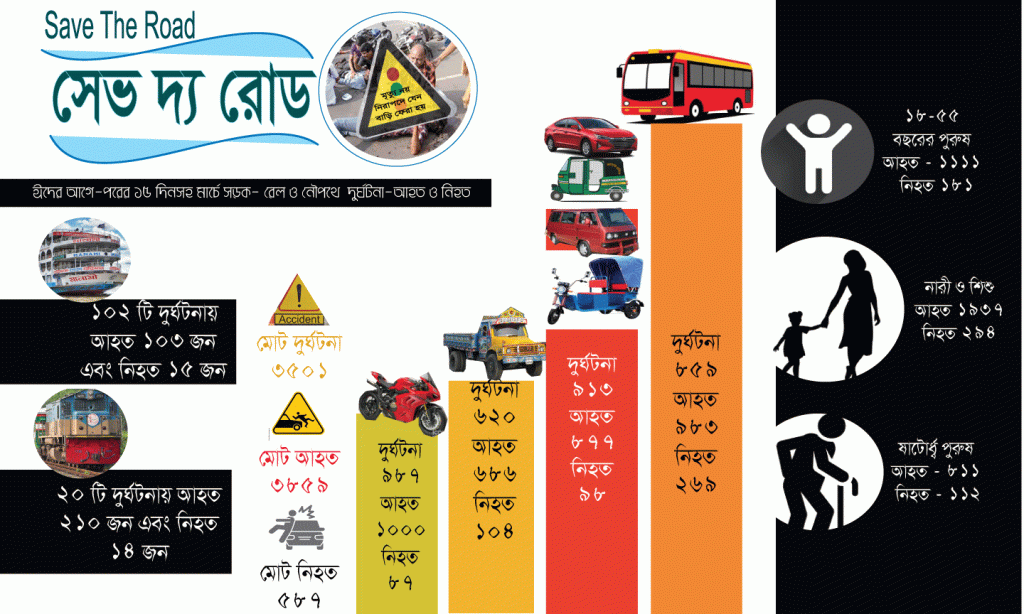 সড়ক-রেল ও নৌপথে ৩৮৫৯ টি দুর্ঘটনায় মোট ক্ষতির পরিমাণ আনুমানিক ৩ শত ২০ কোটি টাকারও বেশি বলে ধারণা করছেন সেভ দ্য রোড-এর গবেষণা সেল সদস্যগণ। আকাশ-সড়ক- রেল ও নৌপথ দুর্ঘটনামুক্ত করার জন্য নিবেদিত দেশের একমাত্র সচেতনতা-গবেষণা ও স্বেচ্ছাসেবি সংগঠন সেভ দ্য রোড-এর পক্ষ থেকে জানানো হয়- ২০২৪ সালের ৮ আগস্ট থেকে যে বিশৃঙ্খলা শুরু হয়েছিলো তৎকালিন যোগাযোগ উপদেষ্টার অবহেলা আর উশকানির পাশাপাশি বিআরটি-এর তৎকালিন চেয়ারম্যানসহ সংশ্লিষ্ট কর্মকর্তাদের আশ্রয়ে-প্রশ্রয়ে, সেই ধারা এখনো অব্যাহত আছে এই সরকারের সময়ে। কারণ অতিতের সরকারগুলোর মত এই সরকারও সড়কে ফিটনেসবিহীন বাস, ড্রাইভিং লাইসেন্সহীন চালক এবং শৃঙ্খলা ফেরাতে ব্যর্থ হয়েছে কেবলমাত্র সংশ্লিষ্ট সেক্টরে জগদ্দল পাথরের মত চেপে থাকা দুর্নীতিবাজ আমলা, মালিক ও শ্রমিক নেতাদের সীমাহীন দুর্নীতি-চাঁদাবাজী ও অপরিকল্পিত পদক্ষেপের কারণে। সড়কে চরম নৈরাজ্য-আইন না মানার সংস্কৃতি তৈরি হওয়ায় ক্রমশ সড়কে দূর্ঘটনা যেমন বৃদ্ধি করছে, তেমন আহত এবং নিহতের সংখ্যাও বাড়াচ্ছে। এমতবস্থায় সেভ দ্য রোড-এর পক্ষ থেকে সরকারি সহায়তার মাধ্যমে সমাজসচেতনতা, গবেষণা ও স্বেচ্ছাসেবি কর্মকাণ্ডের গতি বৃদ্ধির লক্ষ্যে সরকারের মন্ত্রী-সচিবসহ সংশ্লিষ্টদের সুদৃষ্টি প্রয়োজন।