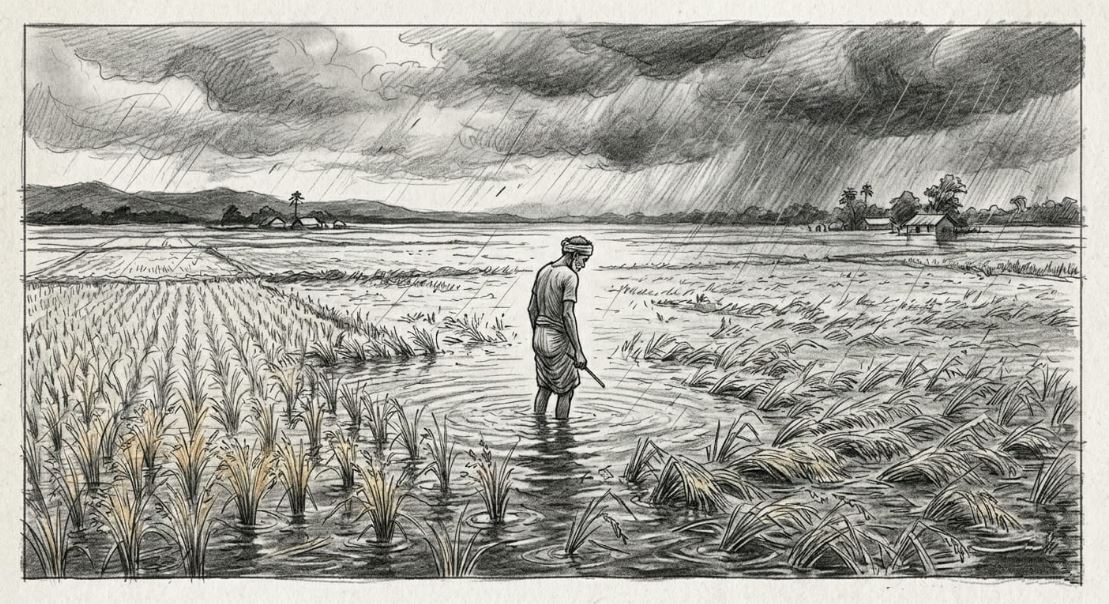 পরিস্থিতির নিয়ন্ত্রণ যখন হাতের বাইরে চলে যায়, তখন সেই নিরুপায় মানুষগুলো কেবল আকাশের পানে চেয়ে থাকেন। সব কিছু থমকে গেছে; তাদের ভাষাগুলো আজ স্তব্ধ। মাঠের আল ধরে হাঁটলে আজ বাতাসের শনশন শব্দের চেয়েও বেশি শোনা যায় কৃষকের চাপা হাহাকার। মাঠের বুক চিরে জেগে ওঠা সেই ফসলগুলো যখন চোখের সামনে তলিয়ে যায়, তখন মানুষের বোধশক্তি লোপ পায়।