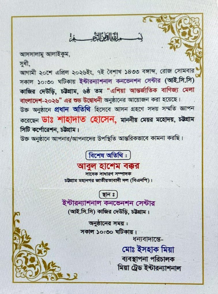 দেশচিন্তা ডেস্ক: আগামীকাল ২০ এপ্রিল, সোমবার সকাল ১০.৩০ ঘটিকায় চট্টগ্রাম কাজীর দেউড়িস্থ ইন্টারন্যাশনাল কনভেনশন সেন্টার (আই.সি.সি) হলে ৬ষ্ঠ “এশিয়া আন্তর্জাতিক বাণিজ্য মেলা বাংলাদেশ-২০২৬” এর শুভ উদ্বোধনী অনুষ্ঠান অনুষ্ঠিত হবে| মিয়া ট্রেড ইন্টারন্যাশনাল’র ব্যবস্থাপনা পরিচালক মোঃ ইসহাক মিয়ার সভাপতিত্বে উক্ত উদ্বোধনী অনুষ্ঠানে প্রধান অতিথি হিসেবে উদ্বোধন করবেন চট্টগ্রাম সিটি কর্পোরেশনের মাননীয় মেয়র ডা. শাহাদাত হোসেন| বিশেষ অতিথি হিসেবে উপস্থিত থাকবেন চট্টগ্রাম মহানগর বিএনপির সাবেক সাধারণ সম্পাদক আবুল হাশেম বক্কর|
