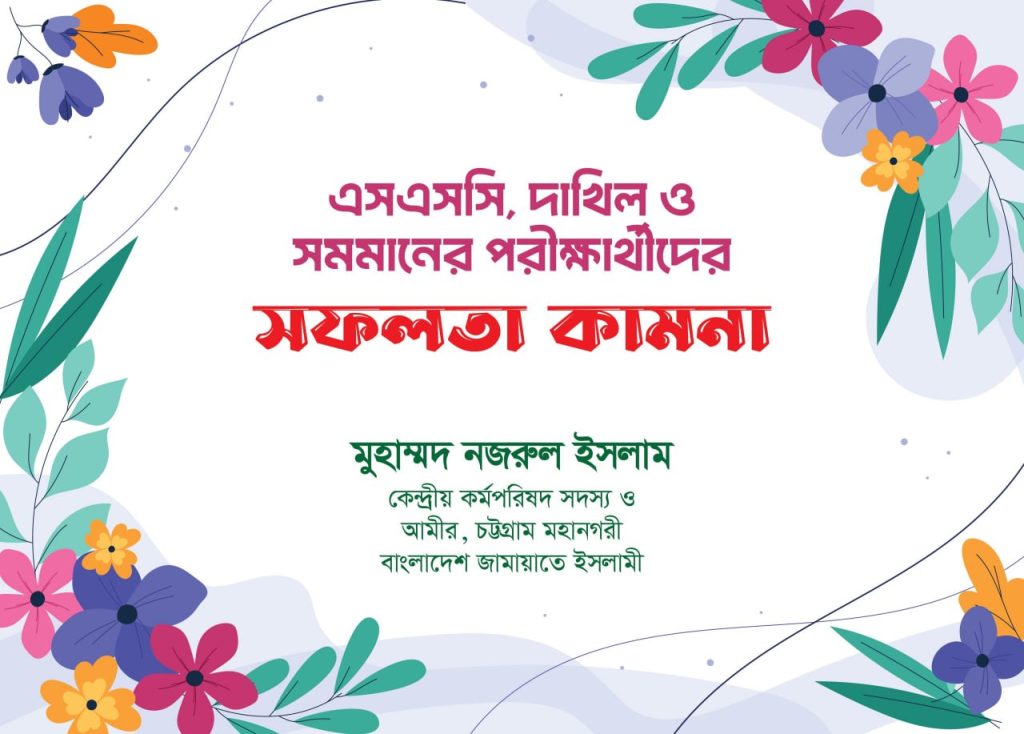 দেশচিন্তা ডেস্ক: এসএসসি, দাখিল ও সমমানের পরীক্ষায় অংশগ্রহণকারী সকল পরীক্ষার্থীদের আন্তরিক শুভেচ্ছা ও দোয়া জানিয়েছেন বাংলাদেশ জামায়াতে ইসলামীর কেন্দ্রীয় কর্মপরিষদ সদস্য ও চট্টগ্রাম মহানগরীর আমীর মুহাম্মদ নজরুল ইসলাম।