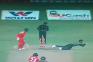 স্পিনার নাজমুল ইসলাম অপুর দলীয় ১১ ও নিজের দ্বিতীয় ওভারে নতুন ব্যাটসম্যান ব্র্যান্ডন টেইলরকে সরাসরি বোল্ড করেন । দারুণ এক রান আউট করে জিম্বাবুয়ের অধিনায়ক হ্যামিল্টন মাসাকাদজাকে ফেরান মুশফিকুর রহিম। এর ফলে তৃতীয় উইকেটের পতন হয় জিম্বাবুয়ের। ১৩তম ওভারের দ্বিতীয় বলে পুশ করে মাসাকাদজা দুই রান নিতে গেলে কায়েসের লম্বা থ্রো থেকে বল নিয়ে ডাইভ দিয়ে স্ট্যাম্প ভেঙে দেন মুশফিক। সফরকারী দলনেতা ৩৪ বলে ২১ রান করে আর মাঠে থাকতে পারে নাই ।